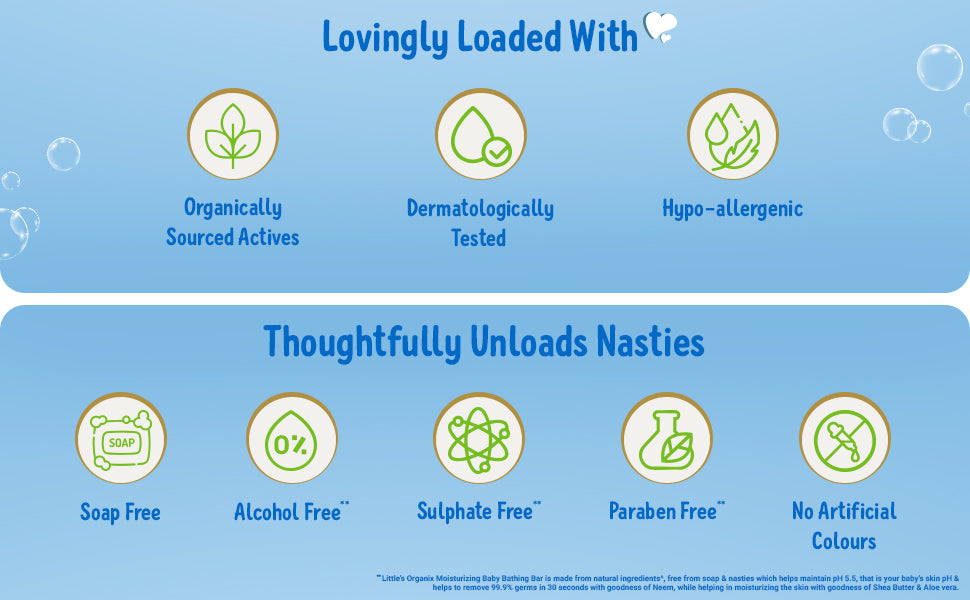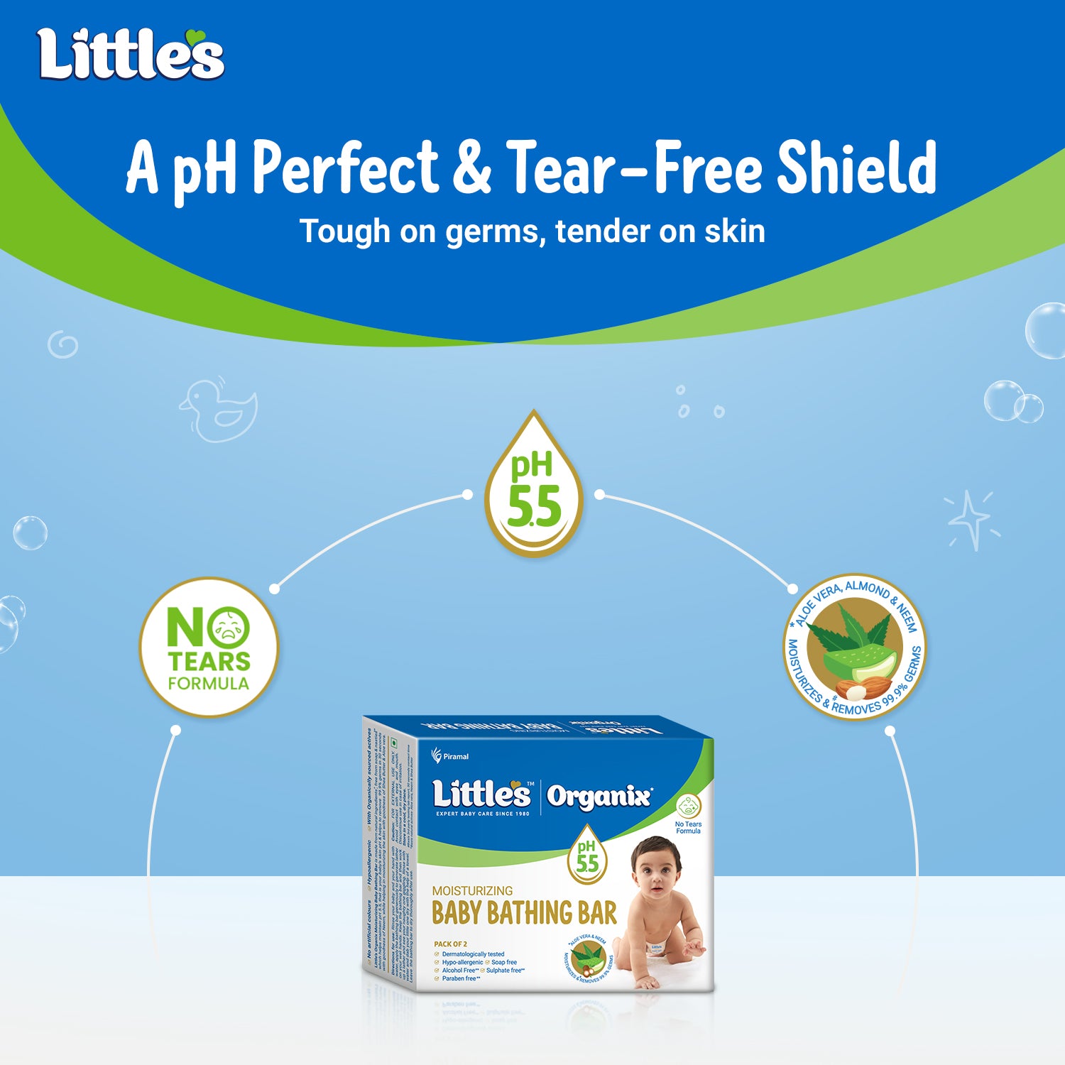 Little’s Organix Moisturizing Baby Bathing Bar is specially formulated to gently cleanse and nourish your baby’s delicate skin. With a skin-balanced pH of 5.5 and a 100% soap-free, tear-free formula, it protects the skin's natural barrier while ensuring a safe and irritation-free bath time experience.